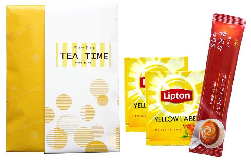 厳選された数十種類もの茶葉がブレンドされたイエローラベルの紅茶ティーバッグと、甘い香りが特徴のマイルドのコーヒースティックのセットです。