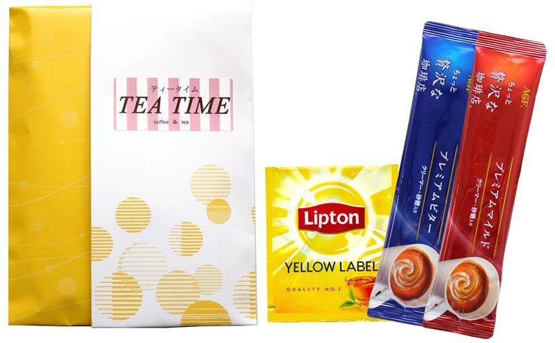 厳選された数十種類もの茶葉がブレンドされたイエローラベルの紅茶ティーバッグと、甘い香りが特徴のまろやかな味わいのマイルド、しっかりとした苦みとコク深い味わいが特徴のビターのコーヒースティックのセットです。
