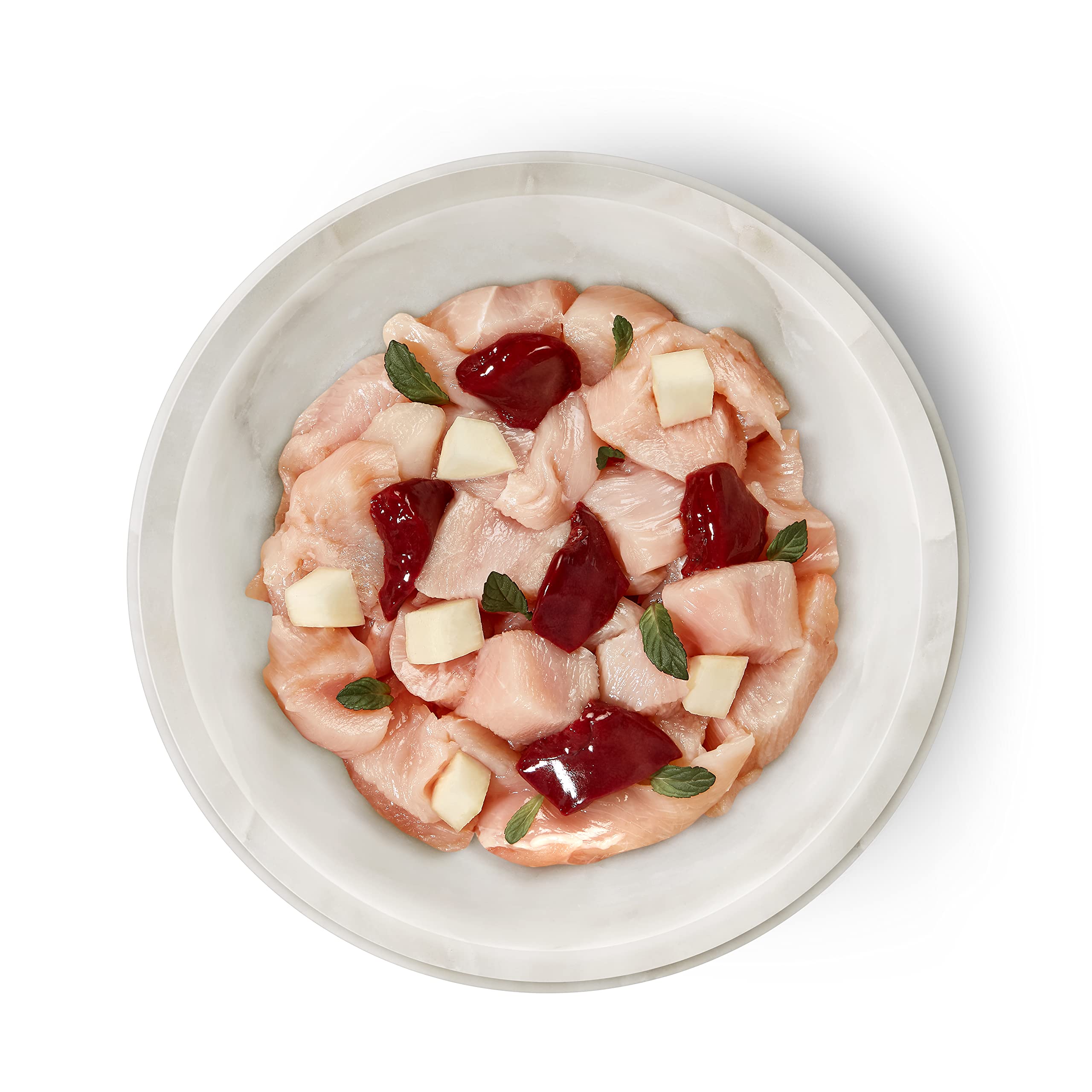鶏の心臓 (30%), 鶏の胃(26%), 鶏の皮(14%), 鶏の筋肉 (10%), 鶏レバー(10%), バターナッツスカッシュ (4%), トマト, 菜種油, キャットニップ, ミネラル類 [成分値]