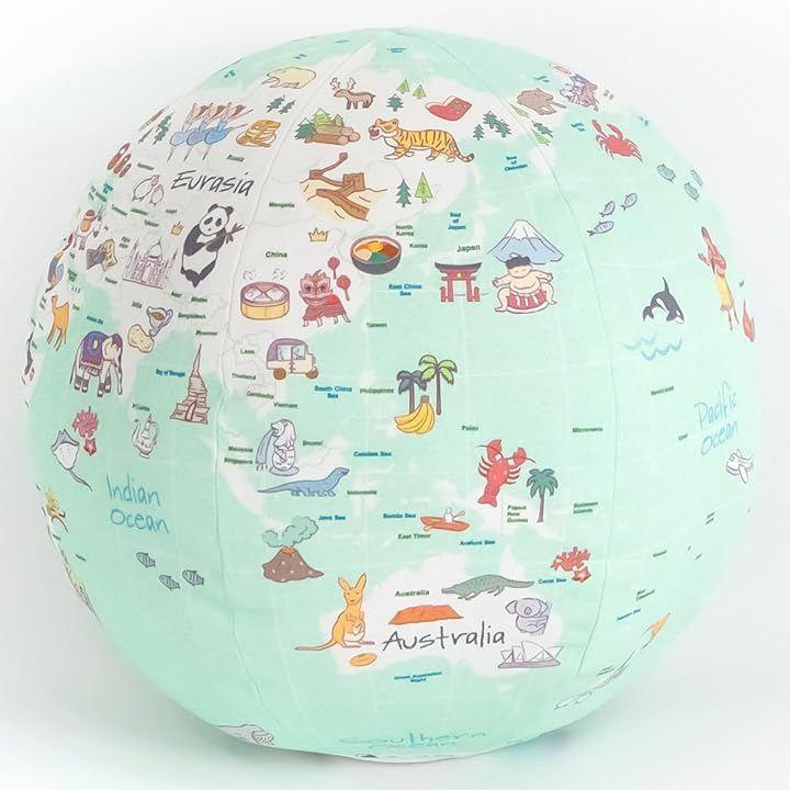 「各国の可愛らしいイラスト」 優しい肌触りの布製の地球儀に、それぞれの地域にぴったりな魅力的なイラストを散りばめました。