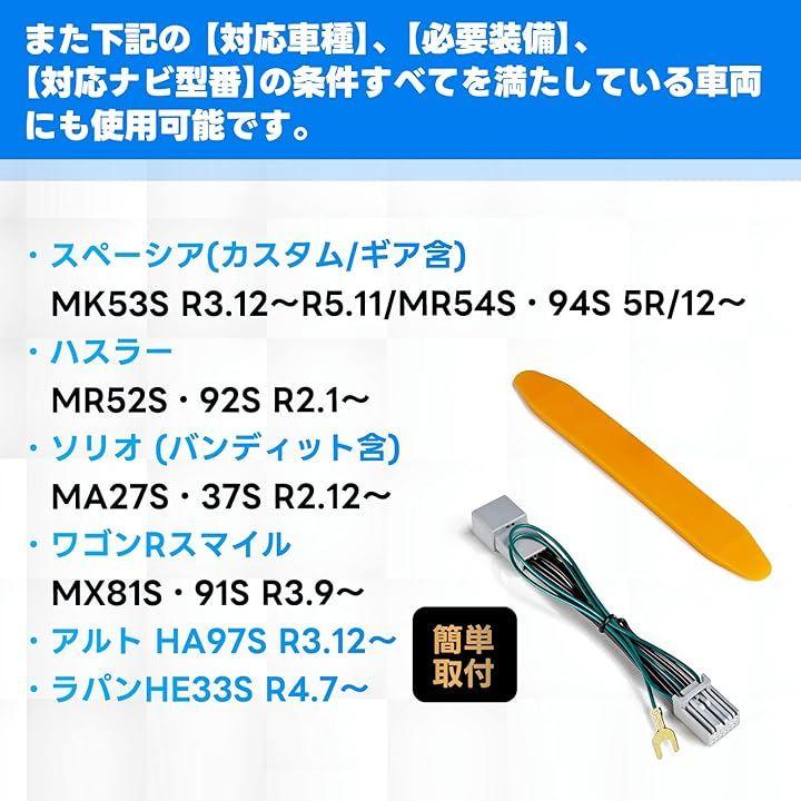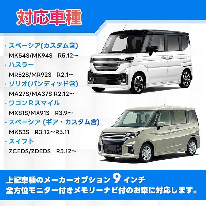 「対応車種/メーカーオプション」メーカーオプション全方位モニター9インチHDディスプレナビ専用(工場装着ナビ専用)スズキ専用:スペーシア(カスタム含) MK54S/MK94S R5.12~| ハスラー MR52S/MR92S R2.1~| ソリオ(バンディッド含) MA27S/MA37S R2.12~| ワゴンRスマイル MX81S/MX91S R3.9~| スペーシア(ギア・カスタム含) MK53S R3.12~R5.11 | スイフト ZCEDS/ZDEDS R5.12~|上記車種のメーカーオプション9インチ全方位モニター付きメモリーナビ付のお車に対応します。