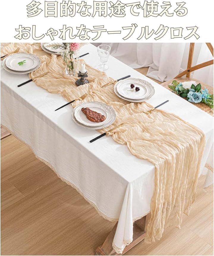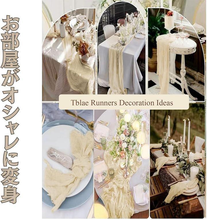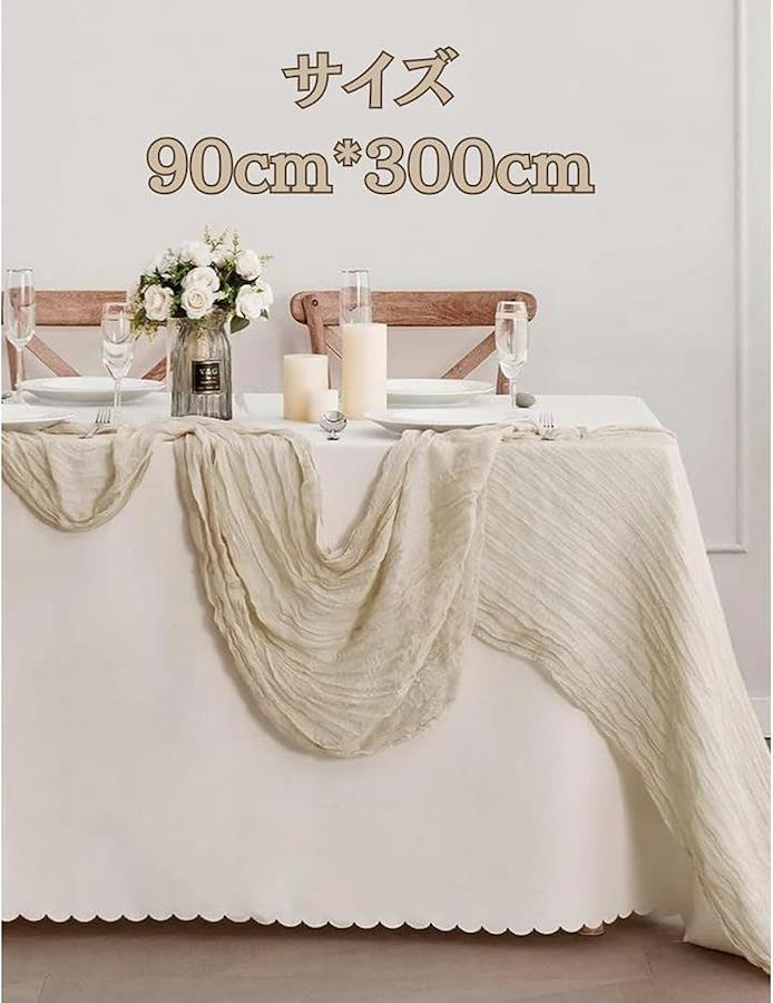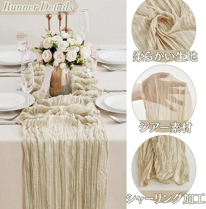 ふんわり優しいチーズクロス素材で高級感アップ 柔らかいガーゼ素材を使用したテーブルランナーは、自然なシワ感と透け感が美しく、上品な雰囲気を演出します。