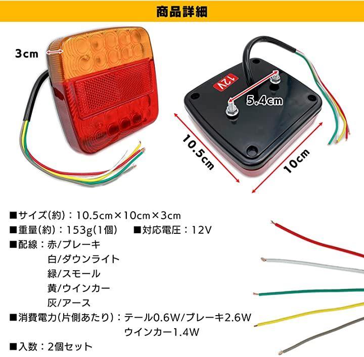 ・「サイズ」10.5cmx10cmx3cm 「重量」約153g (1個あたり) 「電圧」12V 「配線」灰/アース 黄/ウインカー 赤/ブレーキ 緑/スモール 白/ダウンライト *配線の色は予告なく変更になる場合があります。