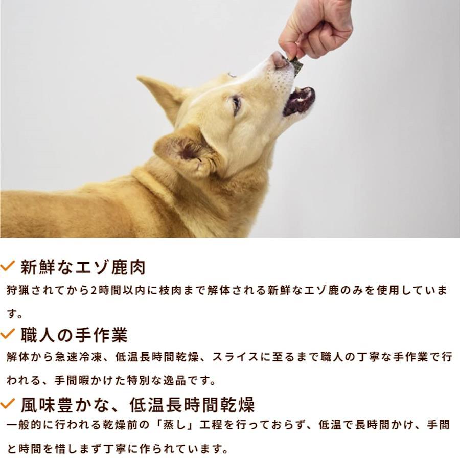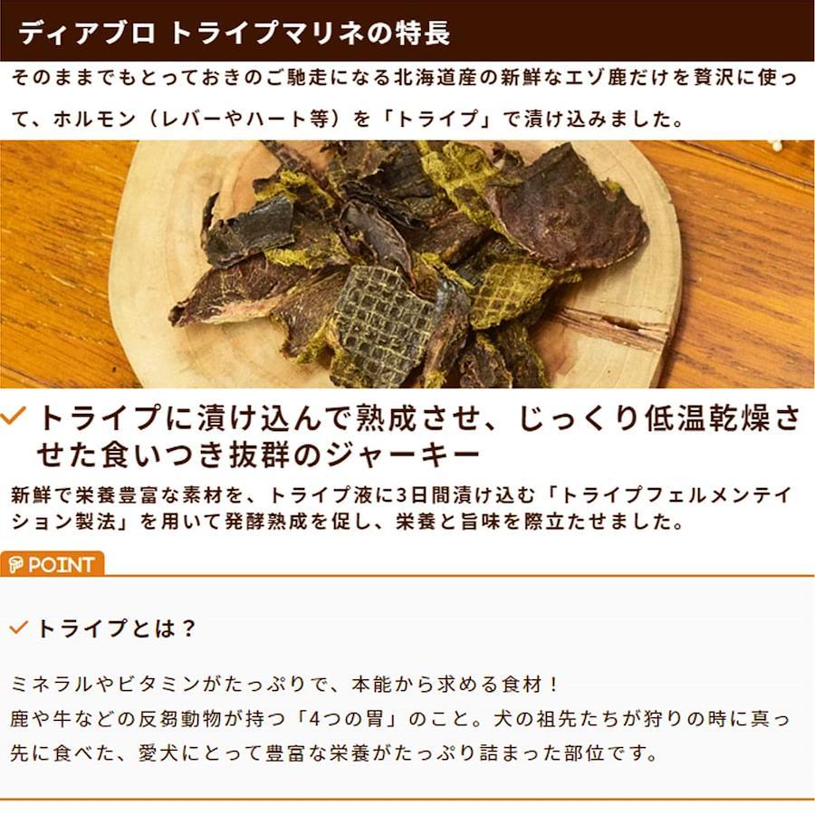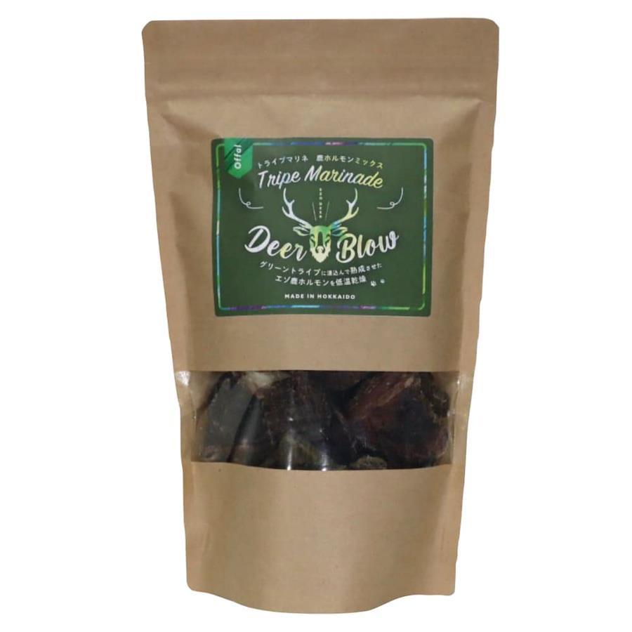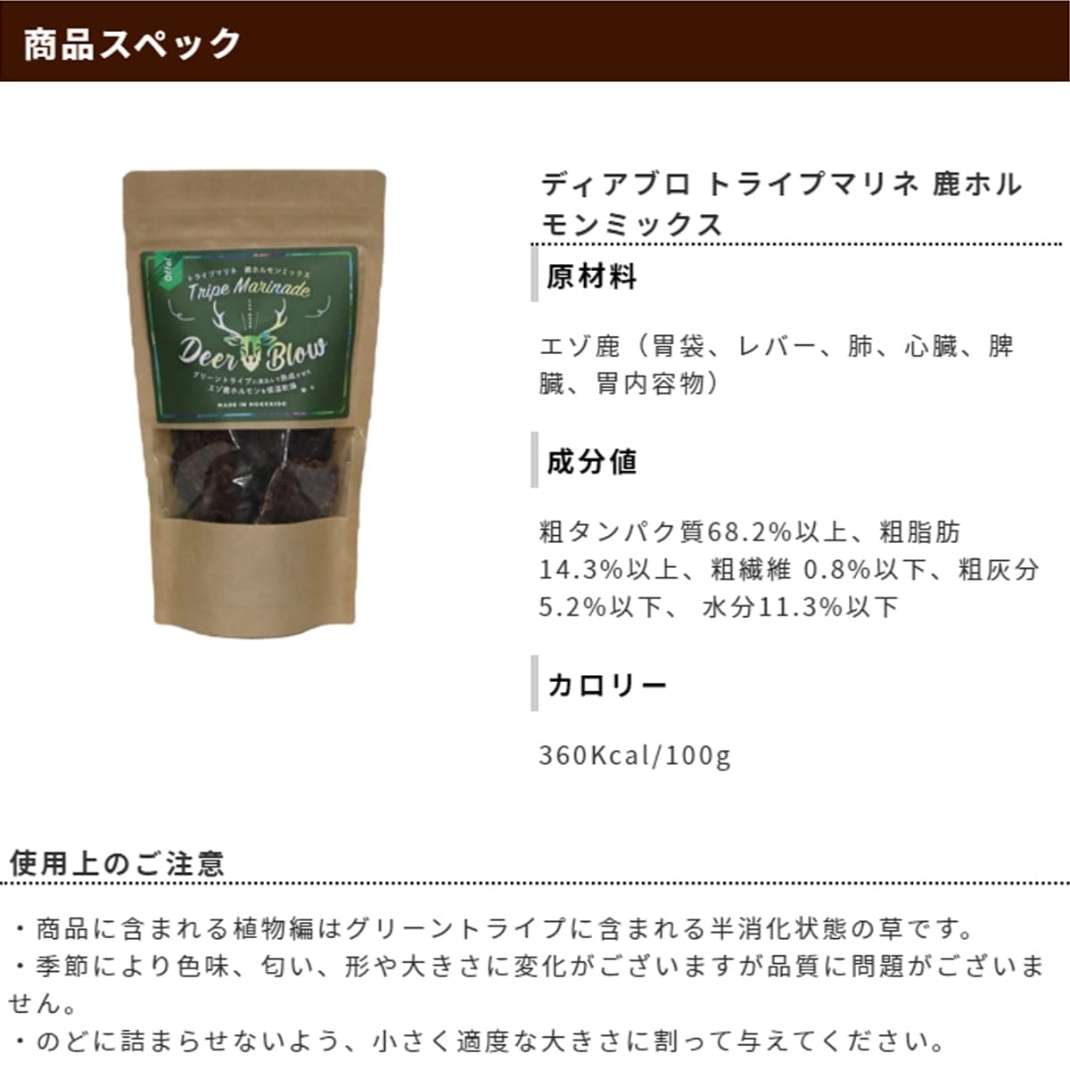 新鮮なエゾ鹿だけを贅沢に使って、ホルモン(レバーやハート等)を「トライプ」で漬け込みました。原材料:エゾ鹿(胃袋、レバー、肺、心臓、脾臓、胃内容物)カロリー:360Kcal/100g保証分析値:粗タンパク質68.2%以上、粗脂肪 14.3%以上、粗繊維 0.8%以下、粗灰分 5.2%以下、 水分11.3%以下