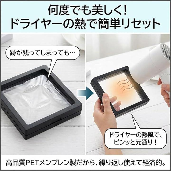 伸縮性のある特殊な高透明フィルムで対象物を挟み込むことであらゆる角度から光を取り込み、あなたの宝物を美しく輝かせるディスプレイケースです。