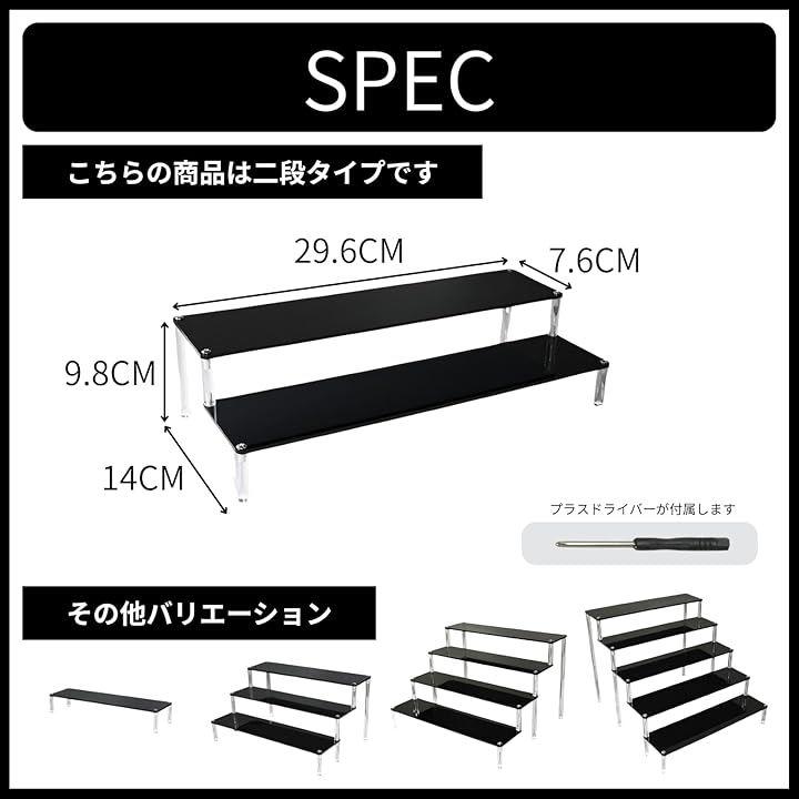 「サイズ」一段:横幅29.6cmx奥行7.6cmx高さ4.8cm、 二段:横幅29.6cmx奥行14cmx高さ9.8cm、 三段:横幅29.6cmx奥行21cmx高さ14.7cm、 四段:横幅29.6cmx奥行26.5cmx高さ19.7cm、 五段:横幅29.6cmx奥行34.5cmx高さ24.8cm 「付属品」プラスドライバー