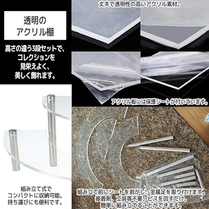 高さの違う3段セットで、コレクション一つ一つが見やすく美しく飾れる透明のアクリル棚です。