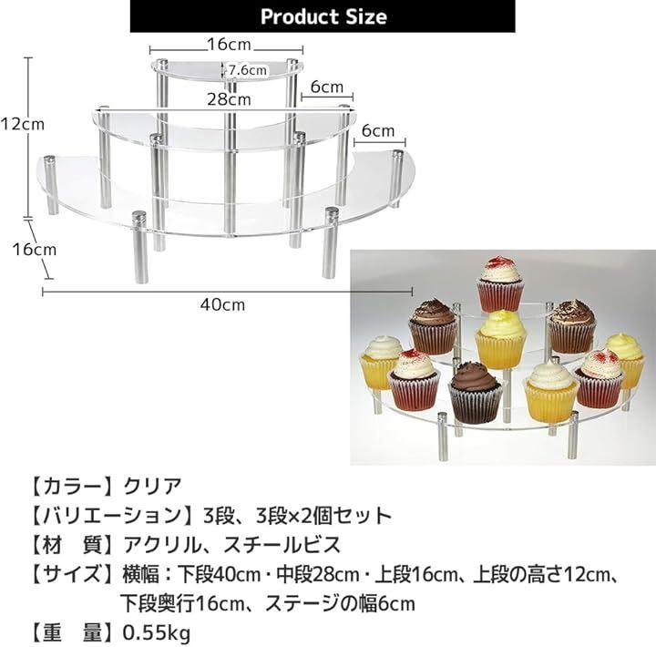 「カラー」クリア「バリエーション」3段、3段x2個セット「材質」アクリル、スチールビス「サイズ」横幅:下段40cm・中段28cm・上段16cm、上段の高さ12cm、下段奥行16cm、ステージの幅6cm「重量」0.55kg