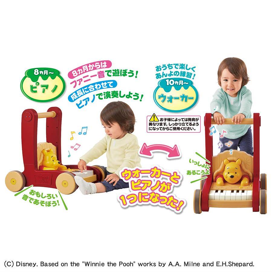 赤ちゃんのウォーカーとピアノトイが1つになりました!くまのプーさんがかわいく動いて赤ちゃんのあんよを応援します。【ピアノ遊び】(1)楽器モード:鍵盤を弾くと3種類の楽器の音(弦楽・オルゴール・ピアノ)でドレミファソラシドを演奏できます。3和音までだせます。(2)ファニー音モード:鍵盤を触ると、たのしいファニー音が出ます。一つ一つの鍵盤に違う音が割り当てられておりハニーポットボタンを押すと違うファニー音のパターンに切り替わります。※パターンは3種です。【ウォーカー遊び】ウォーカーを押すと歩く速度に応じたスピードで音楽が鳴り、プーさんのおしりがかわいく動きます。13種類のプーさんのキャラクターボイスや、17種類の楽しいファニー音、7種類の異なるリズムの音楽が入って、おすわりからあんよまでなが~く遊べます。【セット内容】本体(1),持ち手(一度はめたら取り外しできません)(1), 単3形アルカリ乾電池3本使用(電池は別売です。) ※電池はアルカリ乾電池をご使用ください。 ※誤飲防止のため、電池ケース蓋に「ネジ止め式」を採用しています。 (c) Disney.Based on the "Winnie the Pooh" works by A.A.Milne and E.H.Shepard. パッケージ重量: 2.92 kg 対象性別: unisex