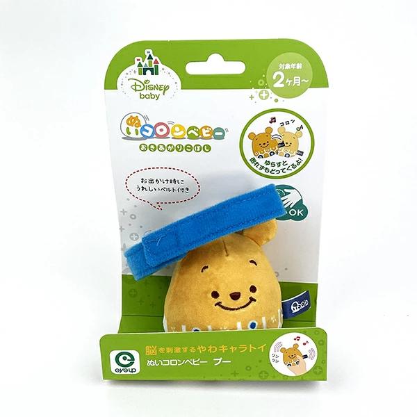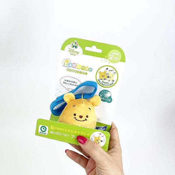 布製のおきあがりこぼしです。お子様が触ったり揺らしたりすると「リンリン」と音をさせながら元の位置に戻ってきます。耳の部分は「パリパリ」と触感や音を楽しむことで脳への刺激となり成長を促してくれます。お出かけ時にベビーカーなどにも取り付け可能なベルト付きです。サイズはギフト用パッケージサイズ表記となります。ギフトにも人気商品です。プーさんは「亀甲」をイメージした和柄デザイン。「鶴亀」に結びつく長寿吉兆を表す紋様デザインとなっております。