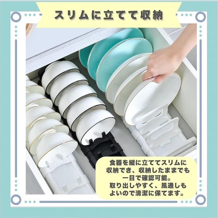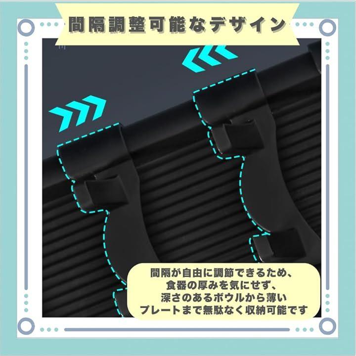 「間隔調整可能なデザイン」間隔が自由に調節できるため、食器の厚みを気にせず、深さのあるボウルから薄いプレートまで無駄なく収納可能です。