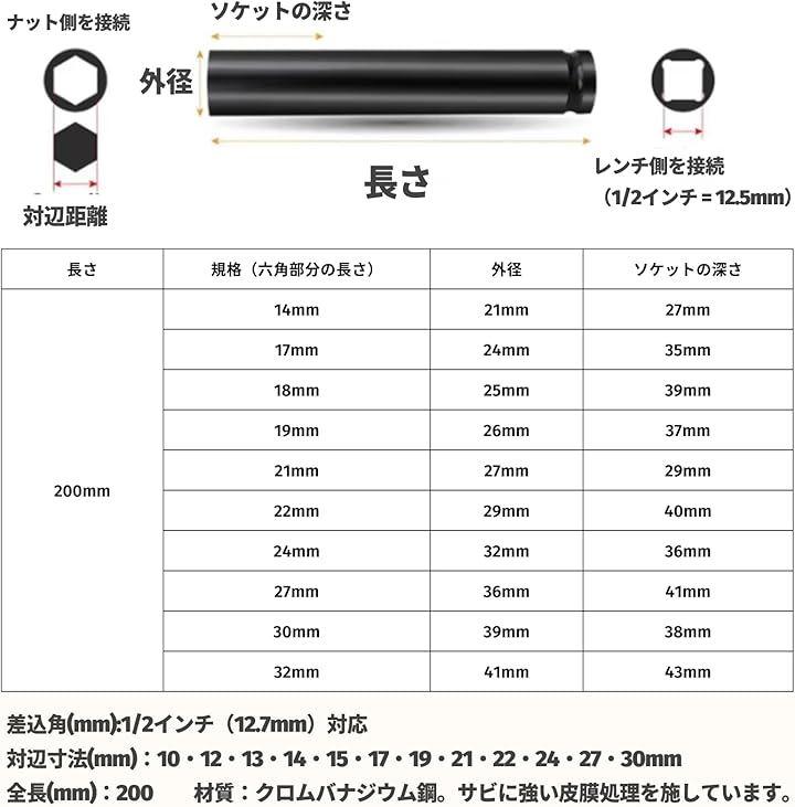 「差込角(mm)」1/2インチ(12.7mm)対応 「対辺寸法(mm)」10・12・13・14・15・17・19・21・22・24・27・30mm 「全長(mm)」200 「材質」クロムバナジウム鋼。