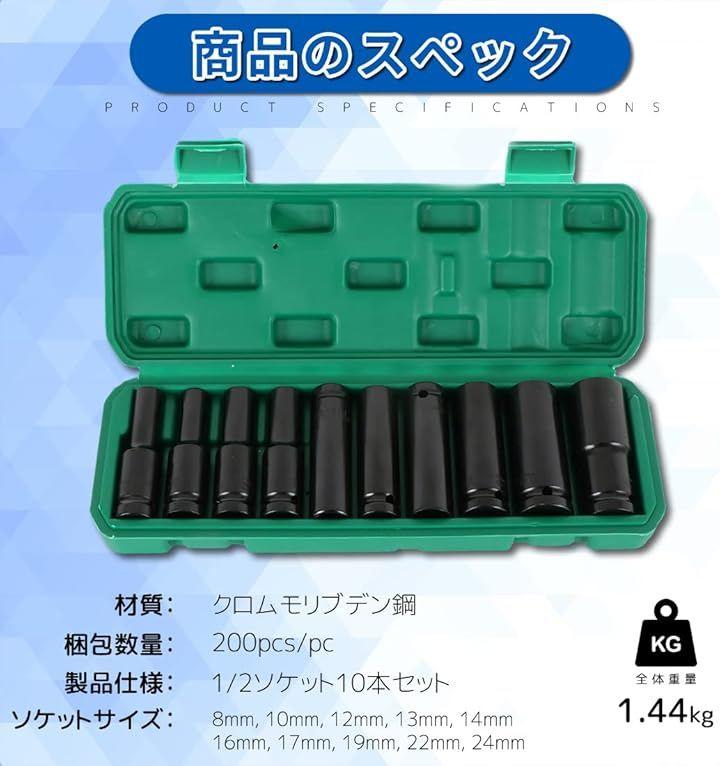 「ディープソケットのサイズ、セット内容」 8, 10, 12, 13, 14, 16, 17, 19, 22, 24 mm 自動車整備、建設現場、バイク整備、自転車整備、各種整備や修理、機械類、家具類、バッテリー交換、DIY作業など多種多様に大活躍しています。