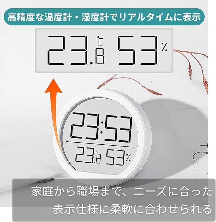「4in1で多機能」温度・湿度・時刻・日付をひと目で確認でき、アラームも搭載。