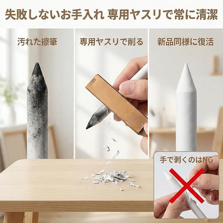 「素材による使い分けで、表現力アップ」 ・紙擦筆(#1-#6):鉛筆の粉を紙の繊維にしっかり押し込むのに最適。