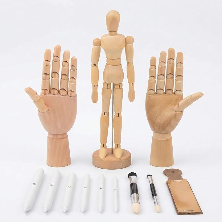 「セット詳細」 ・デッサン人形(人型):1体(高さ21.8cm / 幅6cm) ・ハンドモデル:右手1個、左手1個(高さ17.5cm / 幅3.6cm) ・紙擦筆:6サイズ(#1~#6) ・スポンジ擦筆:2サイズ(大小) ・研磨用紙ヤスリ:1本