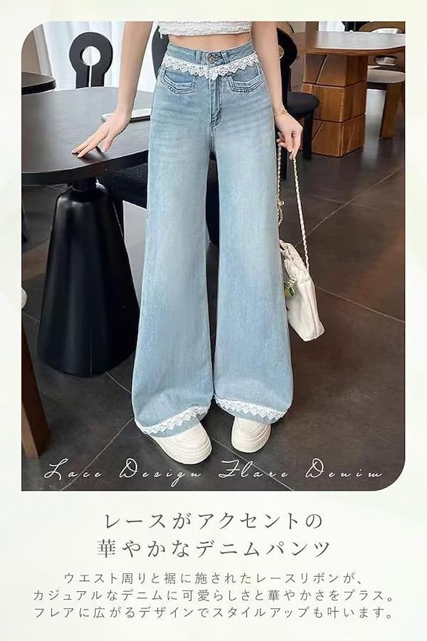 レースの装飾が特徴的な、エレガントで華やかなフレアデニムパンツです。