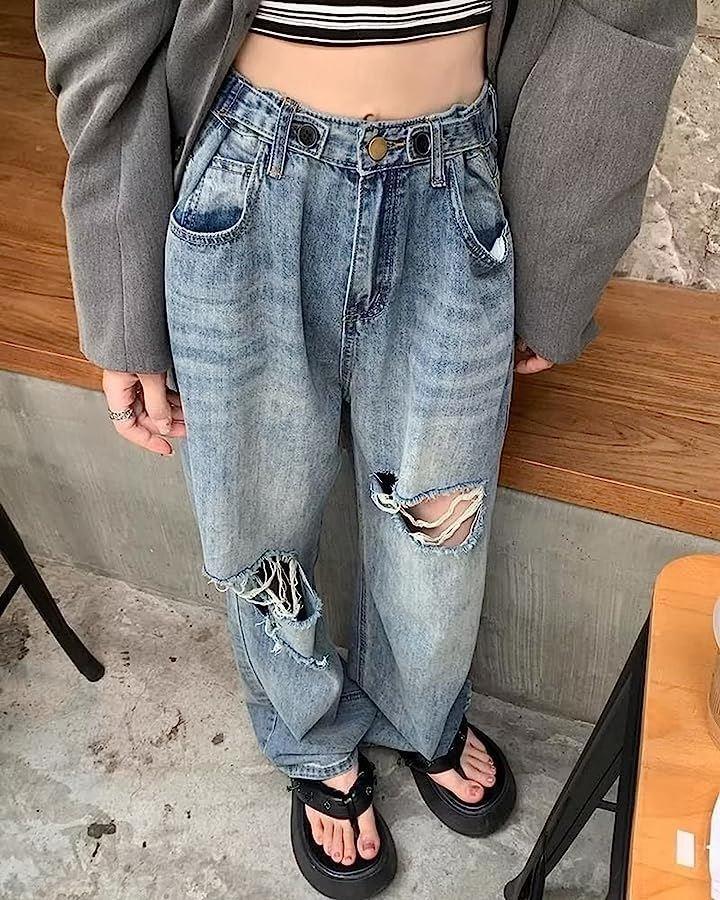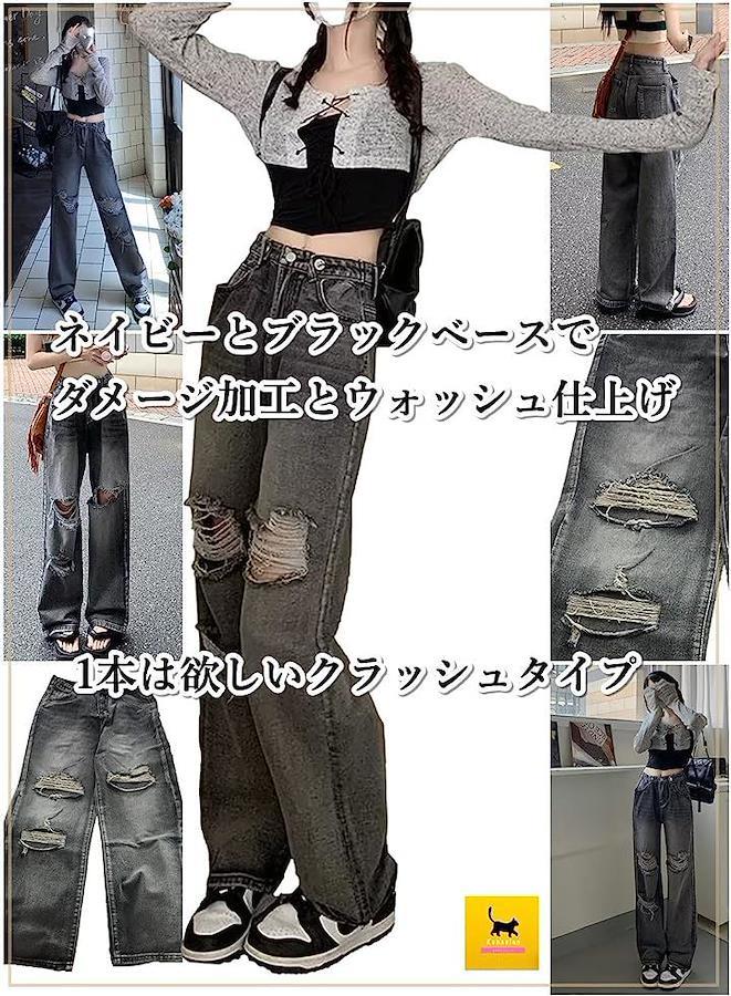 膝周りにダメージ加工されたウォッシュ加工のストレートデニムです。