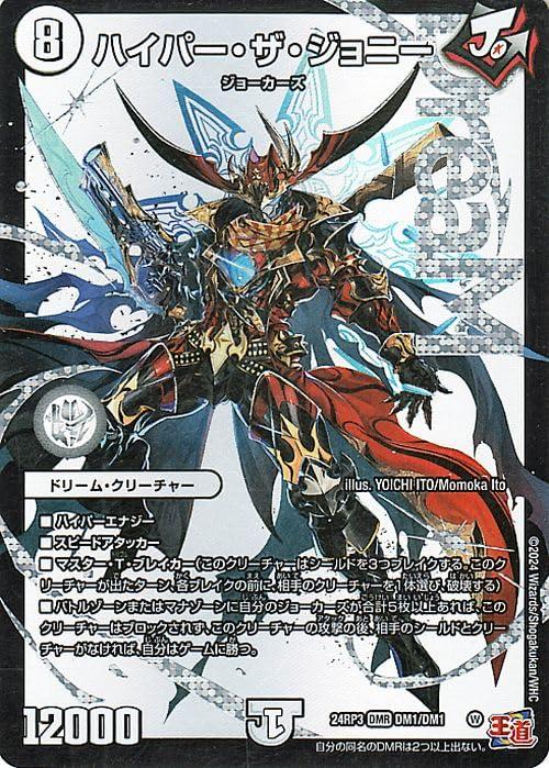 通常1-5営業日で発送【新品未開封品】デュエルマスターズTCG 王道篇 第3弾「ゴールド・オブ・ハイパーエンジェル」(DM24-RP3)収録 ■カード名:ハイパー・ザ・ジョニー ■Card Name:Hyper the Johnny ■レアリティ:ドリームレア ■種類:ドリーム・クリーチャー ■文明:ゼロ文明 ■種族:ジョーカーズ ■パワー:12000 ■コスト:(8) [特殊能力] ■ハイパーエナジー ■スピードアタッカー ■マスター・T・ブレイカー(このクリーチャーはシールドを3つブレイクする。このクリーチャーが出たターン、各ブレイクの前に、相手のクリーチャーを1体選び、破壊する) ■バトルゾーンまたはマナゾーンに自分のジョーカーズが合計5枚以上あれば、このクリーチャーはブロックされず、このクリーチャーの攻撃の後、相手のシールドとクリーチャーがなければ、自分はゲームに勝つ。 ■自分の同名のDMR(ドリームレア)は2つ以上出ない。