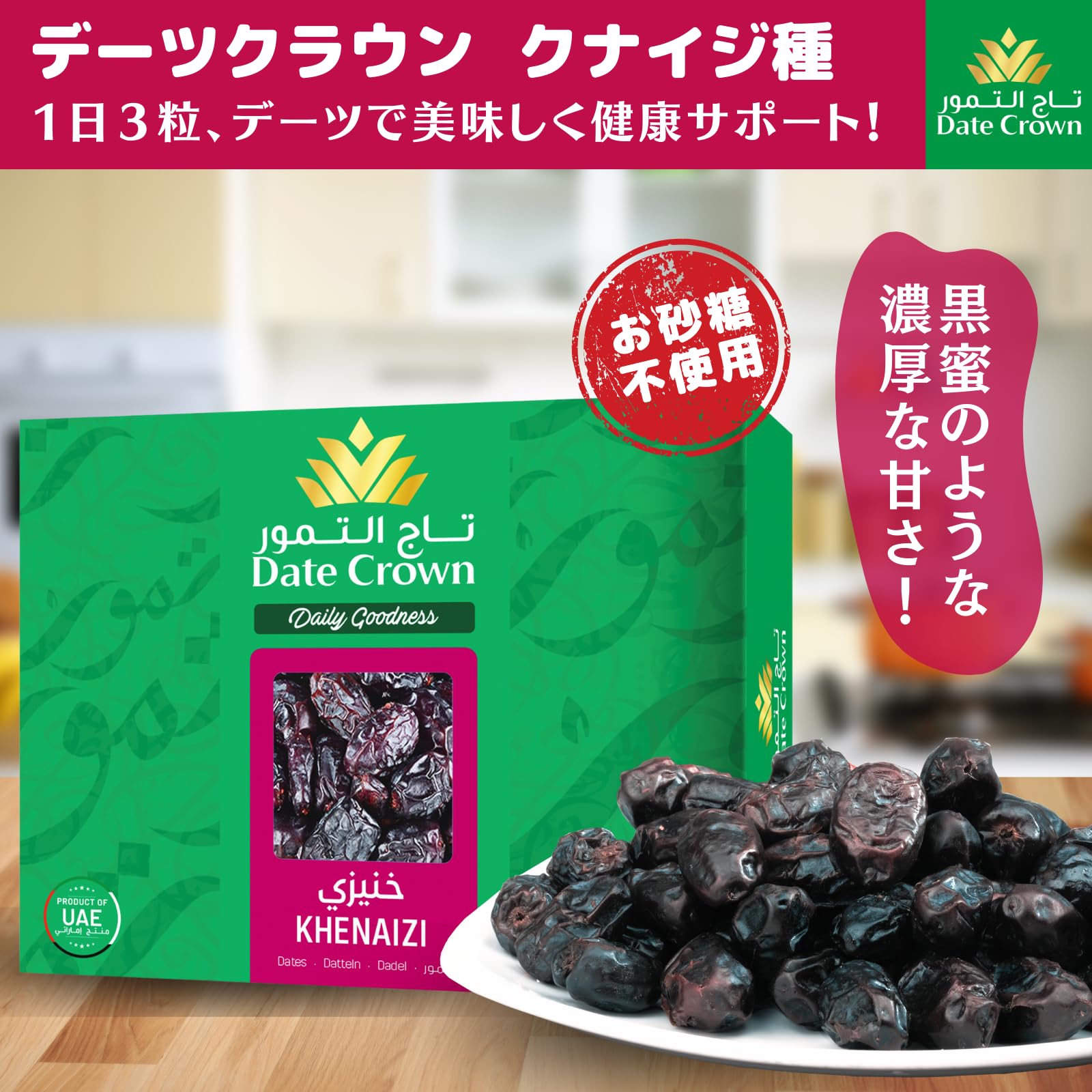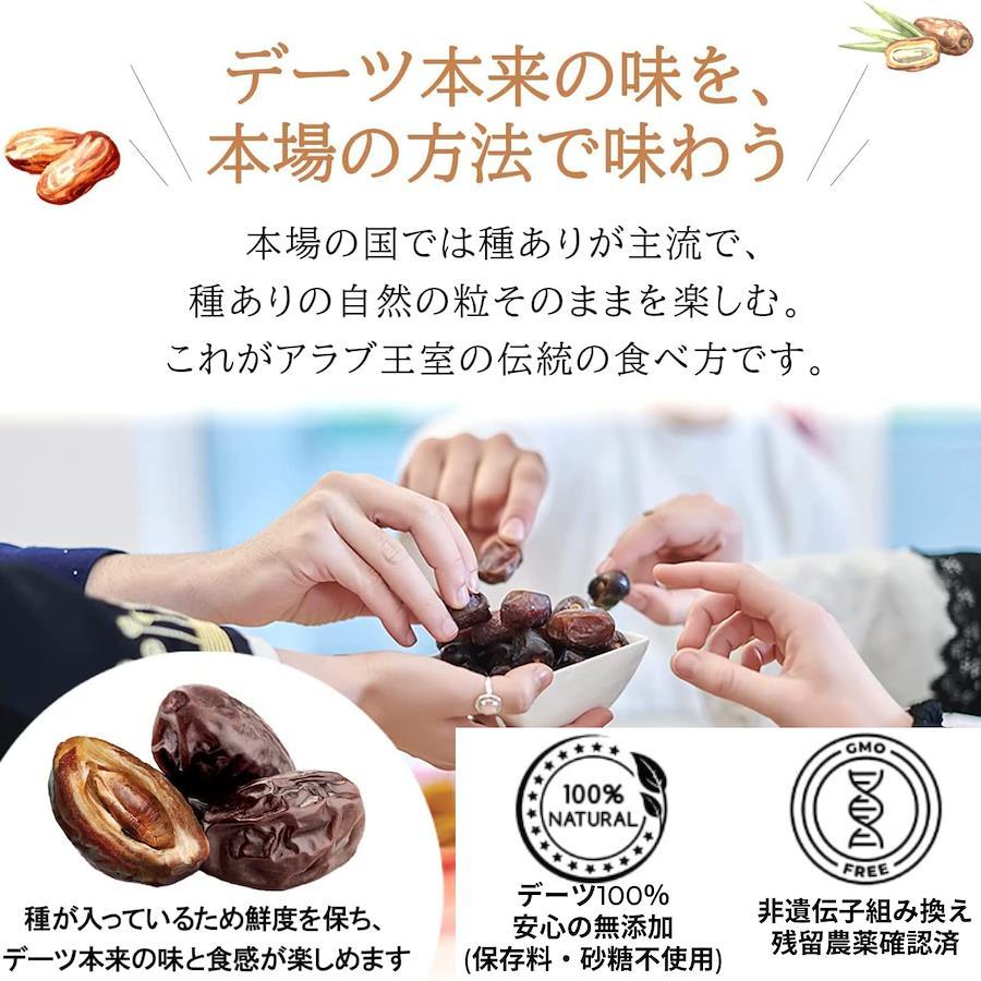 3営業日以内に発送≪新品未開封品≫アルフォア社(UAE)のインターナショナルブランド「デーツクラウン」の「Khenaizi(クナイジ) 種」のデーツです。UAE産最高品質のデーツ100%で作られ世界46カ国で親しまれています。もちろん、無添加・砂糖不使用・非遺伝子組換えです。こちらのデーツは、 ISO 22000を取得し HACCPを導入した国際標準の最新鋭の生産設備で生産・管理されていますので安心してお召し上がり頂けます。「Khenaizi 種」は、ブラック・ビューティと呼ばれるほどの綺麗な黒色で、味はデーツの中でも特に濃厚な甘味と深いコクがあり果肉はふっくらと柔らかいのが特徴です。同ブランドの「Khalas種」より濃厚な甘味とねっとりとしたセミドライの食感を楽しみたい方にお勧めのデーツです。高い品質基準をクリアした、王室御用達の最高の味を是非お試しください。大切な方へのプレゼントにもどうぞ。