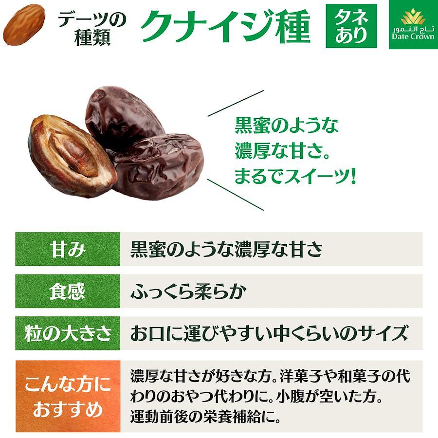 【まさにデーツクラウン(デーツの王冠)】Date Crown(デーツクラウン)はアラブ王国御用達のブランドで、世界48か国で親しまれている世界最大のデーツブランドの一つです。アルフォア社(UAE) のインターナショナルブランドが、UAE産の完熟デーツの中でもより高い基準をクリアした高品質なデーツを日本にお届けしています。【本来のデーツの味を楽しむ】デーツクラウンのデーツは、種入りです。種抜きは実をカットするため少し硬い食感ですが、デーツクラウンは種入りのためデーツ本来の柔らかさを味わうことができます。本場のデーツを本場の食べ方で、それがデーツクラウンのこだわりです。無添加、砂糖不使用、オイル不使用、非遺伝子組換え、残留農薬検査済(日本)のデーツです。【クナイジ種】黒色で黒糖のような濃厚な甘さと旨味が特徴のクナイジ種。原産地の中東では、その黒色の粒からブラックビューティーとも呼ばれています。黒蜜のようなキレの良い甘さは、デーツを初めて食べる日本人の方にもオススメです。【スーパーフードのデーツ】スーパーフードのデーツは、一粒に栄養素がぎっしり。食物繊維・カリウム・マグネシウム・鉄・各種ビタミンなど栄養素がたっぷり含まれており、その栄養素の高さから、中東ではラマダンの断食後にデーツが重要な栄養補給源として食べられています。原材料:デーツ クナイジ種 (1Kg) 光沢のあるデザイン箱入りでプレゼントにも。保存方法:高温多湿を避け、冷暗所にて保存。※洗浄後には十分な選別を行っておりますが、稀に虫が混入していることがございます。デーツは天然の実であり、100%の防止は困難であることをご了承ください。【重要】メーカーによる商品リニューアルに伴いパッケージ(内容量も含む)変更が行われた場合、新パッケージでお届け致します事ご了承願います。