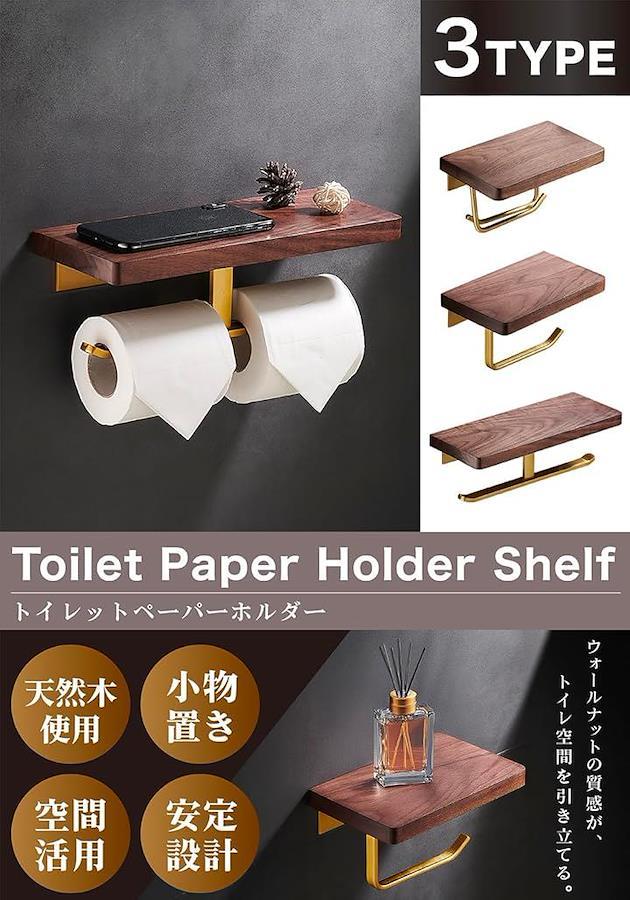 このトイレットペーパーホルダーは、天然木の美しい木目を持つウォールナットと、高級感のある金属パーツを組み合わせた洗練デザインが特徴です。