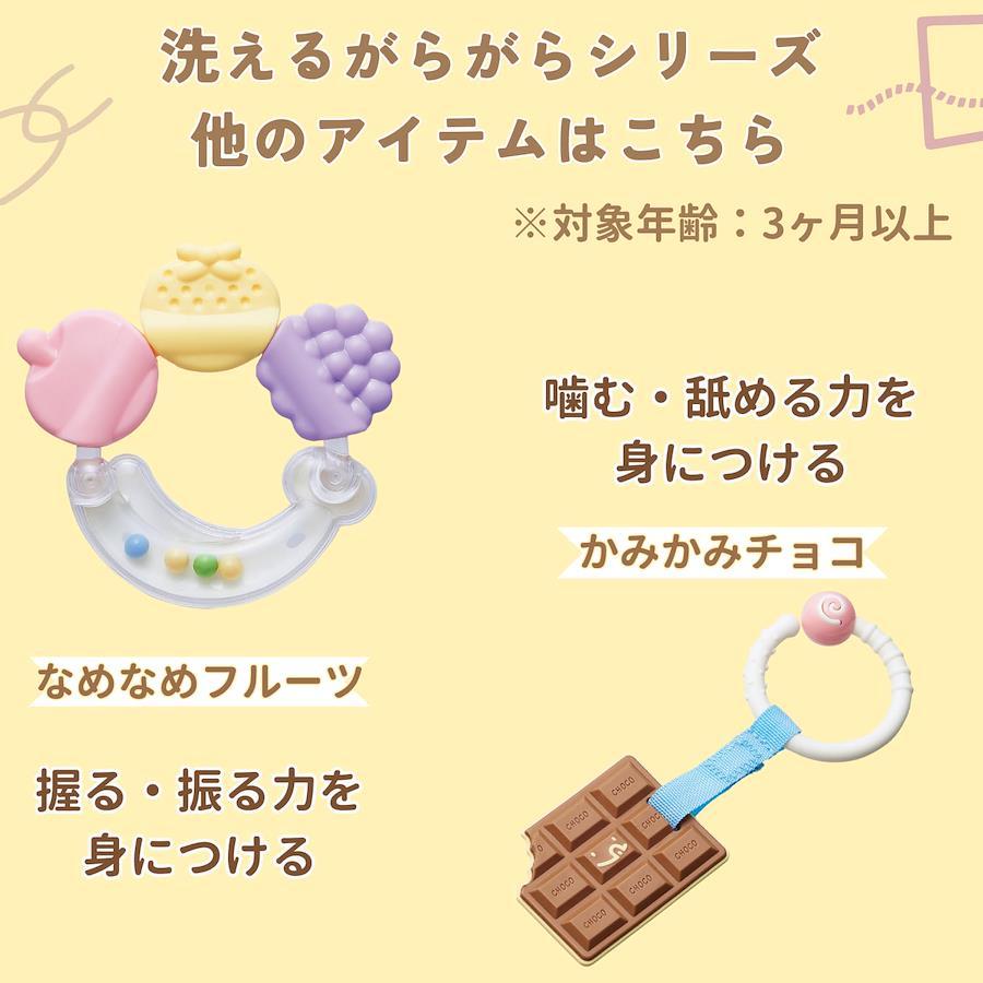 ガラガラは意外と洗えないものが多い…というママの悩みを解決しました!”いつも清潔”で安心を届ける、赤ちゃんにやさしい”丸洗いできる”ガラガラシリーズです。赤ちゃんにやさしい無塗装だからなめても安心!ネジを一切使用していないから、赤ちゃんがネジを飲み込む危険もなくて安心!台紙とプラスチックカバーは100%再生原料を使用しているので環境にも安心! やわらかいフルーツが3種類の歯固めです。振ると小さいビーズが"ジャラジャラ"なります♪