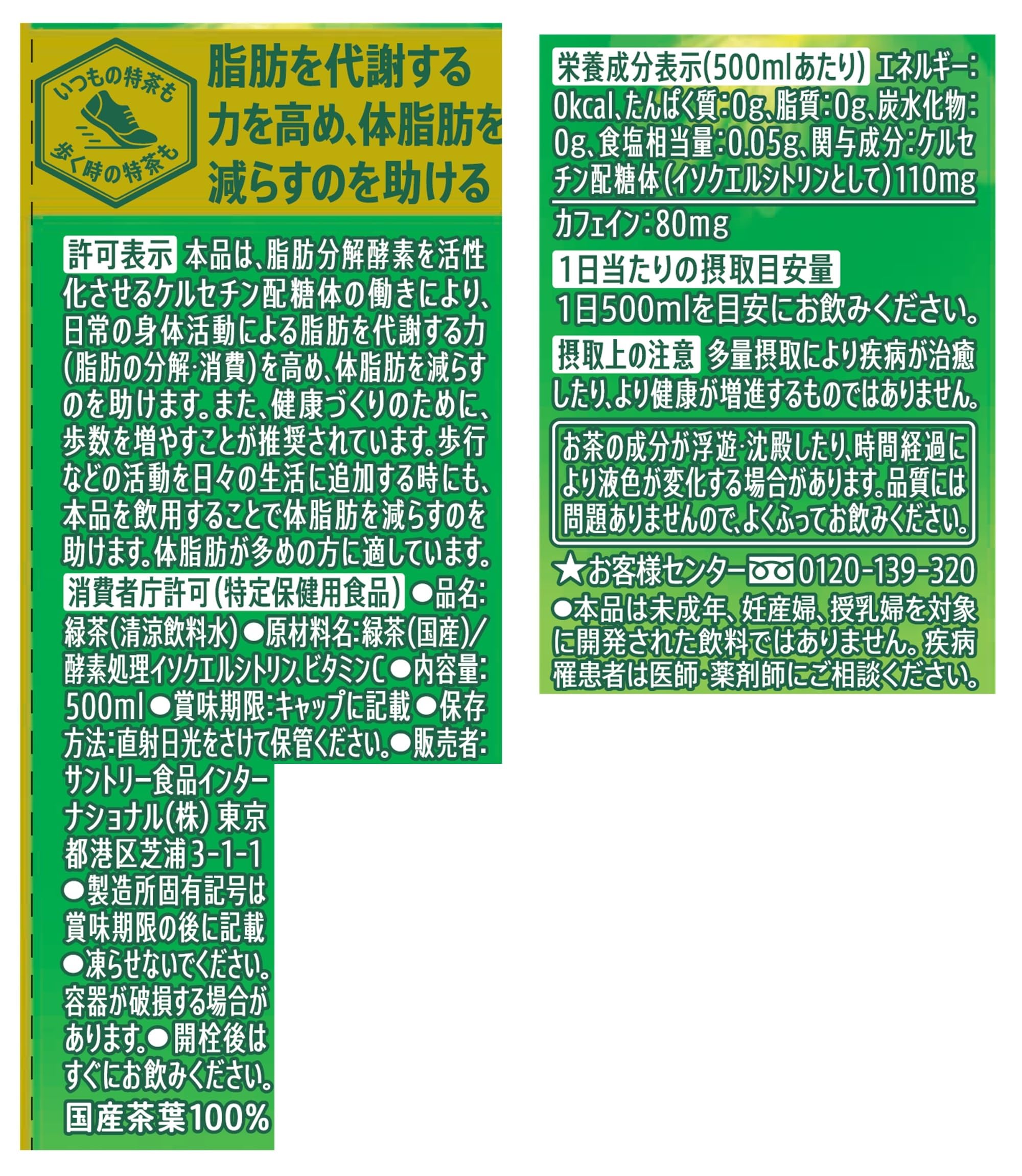 【許可表示】本品は、脂肪分解酵素を活性化させるケルセチン配糖体の働きにより、日常の身体活動による脂肪を代謝する力(脂肪の分解・消費)を高め、体脂肪を減らすのを助けます。また、健康づくりのために、歩数を増やすことが推奨されています。歩行などの活動を日々の生活に追加する時にも、本品を飲用することで体脂肪を減らすのを助けます。体脂肪が多めの方に適しています。 【摂取上の注意】多量摂取により疾病が治癒したり、より健康が増進するものではありません。 【1日当たりの摂取目安量】 1日500mlを目安にお飲み下さい。 特定保健用食品 サントリー緑茶 伊右衛門特茶 ラベルレス 500ml×24本は、関与成分「ケルセチン配糖体」の働きにより、「脂肪を代謝する力を高め、体脂肪を減らすのを助ける」おいしいトクホ茶のラベルレス。健康茶としての満足感と毎日のおいしさにこだわった中味で、効能感・満足感に繋がる程よい苦みで毎日でも飲み飽きない味わいです。苦味を構成する“一番茶”比率を高め、健康茶として満足感のある味わい。後味のバランスを見直し、よりすっきりとした余韻を実現。お仕事中や、お食事と一緒にどうぞ。