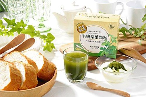 有機JAS認証の畑で大切に育てられた九州産の桑葉を使用しています。桑の葉には、健康維持に欠かせない「食物繊維・カルシウム・鉄・亜鉛・マグネシウム」が多く含まれています。食事と一緒に楽しく美味しく飲んで欲しいから、どんな食事にも合う後味すっきりの爽やかな味わいに仕上げました。「ドレッシングやソースと混ぜて」「ヨーグルトやアイスクリームにふりかけて」お料理のちょい足し食材としてもご使用頂けます。 商品サイズ (幅×奥行×高さ) :130mm×65mm×118mm 内容量:90g (1.5g×60包)