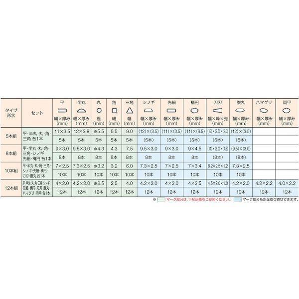 ●組ヤスリの5本組~12本組は全長を表します。5本組=215mm 8本組=200mm10本組=185mm 12本組=170mm