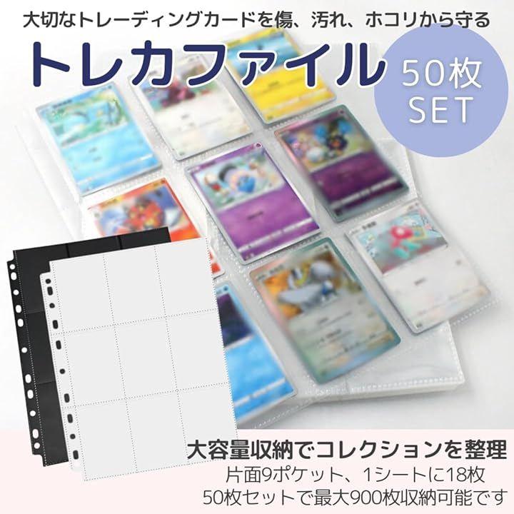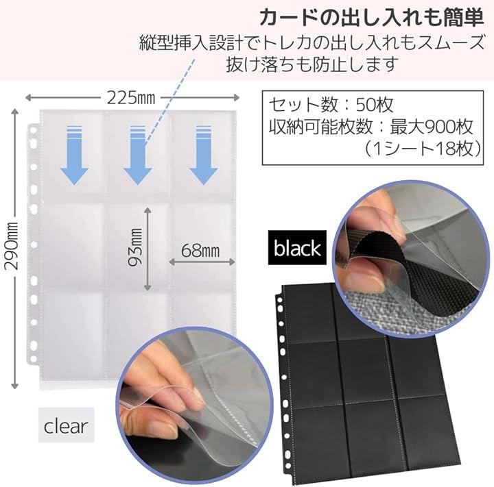 「商品詳細」セット数:50枚 収納可能枚数:最大900枚(1シート18枚) シートサイズ:290 x 225(mm) ポケットサイズ:93x68(mm) カラー:クリア/ブラック