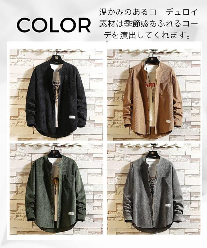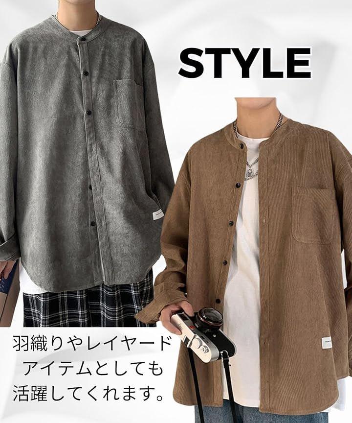 温かみのあるコーデュロイ素材と首元のバンドカラーで、季節感あふれるカジュアルコーデを演出してくれます。