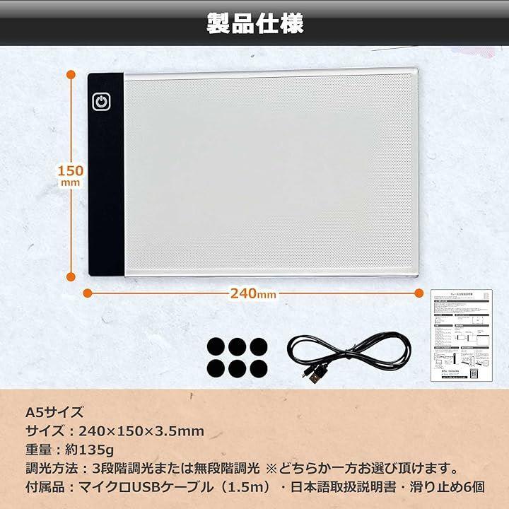 「製品仕様」サイズ:240x150x3.5mm 重量:約135g 調光方法:3段階調光または無段階調光 *どちらか一方お選び頂けます。