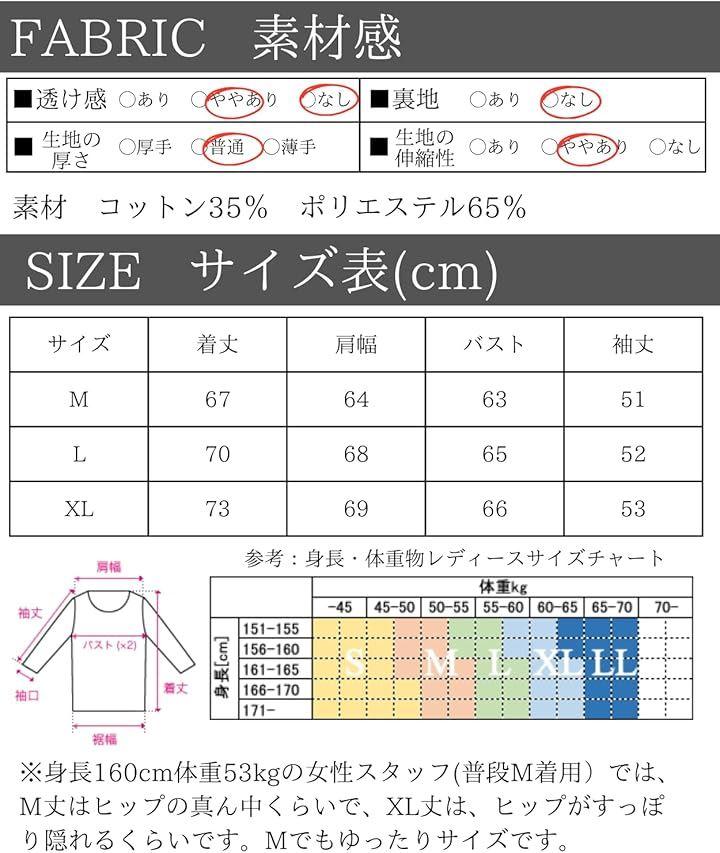 「素材」コットン35% ポリエステル65% 「カラー」白、黒、紫「サイズ(cm)」M 着丈67/肩幅64/バスト63/袖丈51 L 着丈70/肩幅68/バスト65/袖丈52 XL 着丈73/肩幅69/バスト66/袖丈53