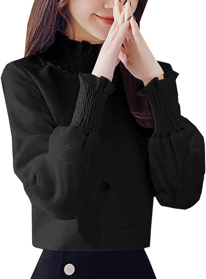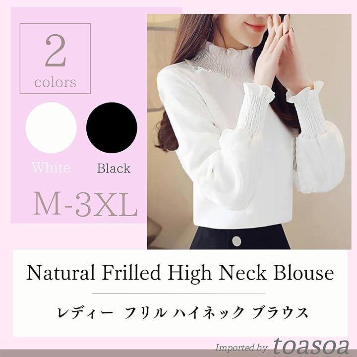シンプルなボディにえりや袖口のさりげないフリルがかわわい清楚なハイネックプルオーバーブラウス。