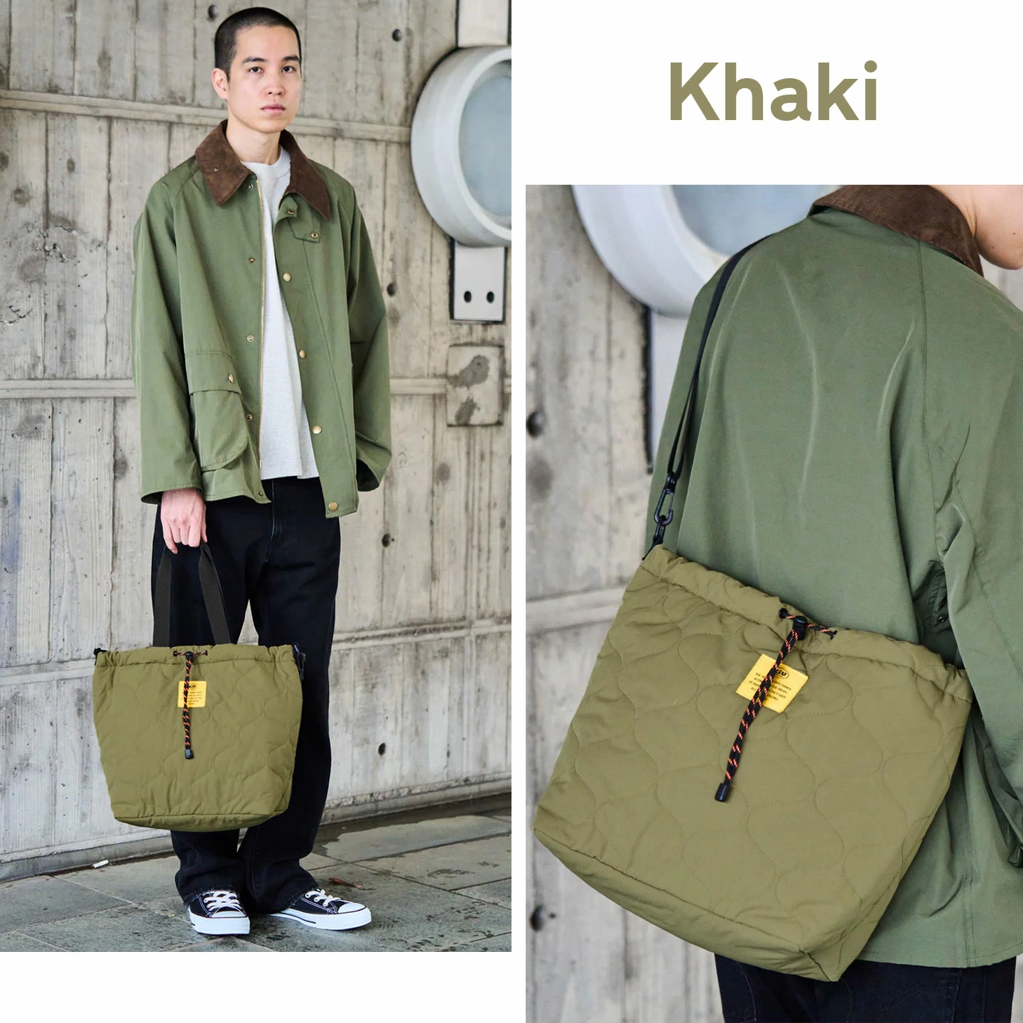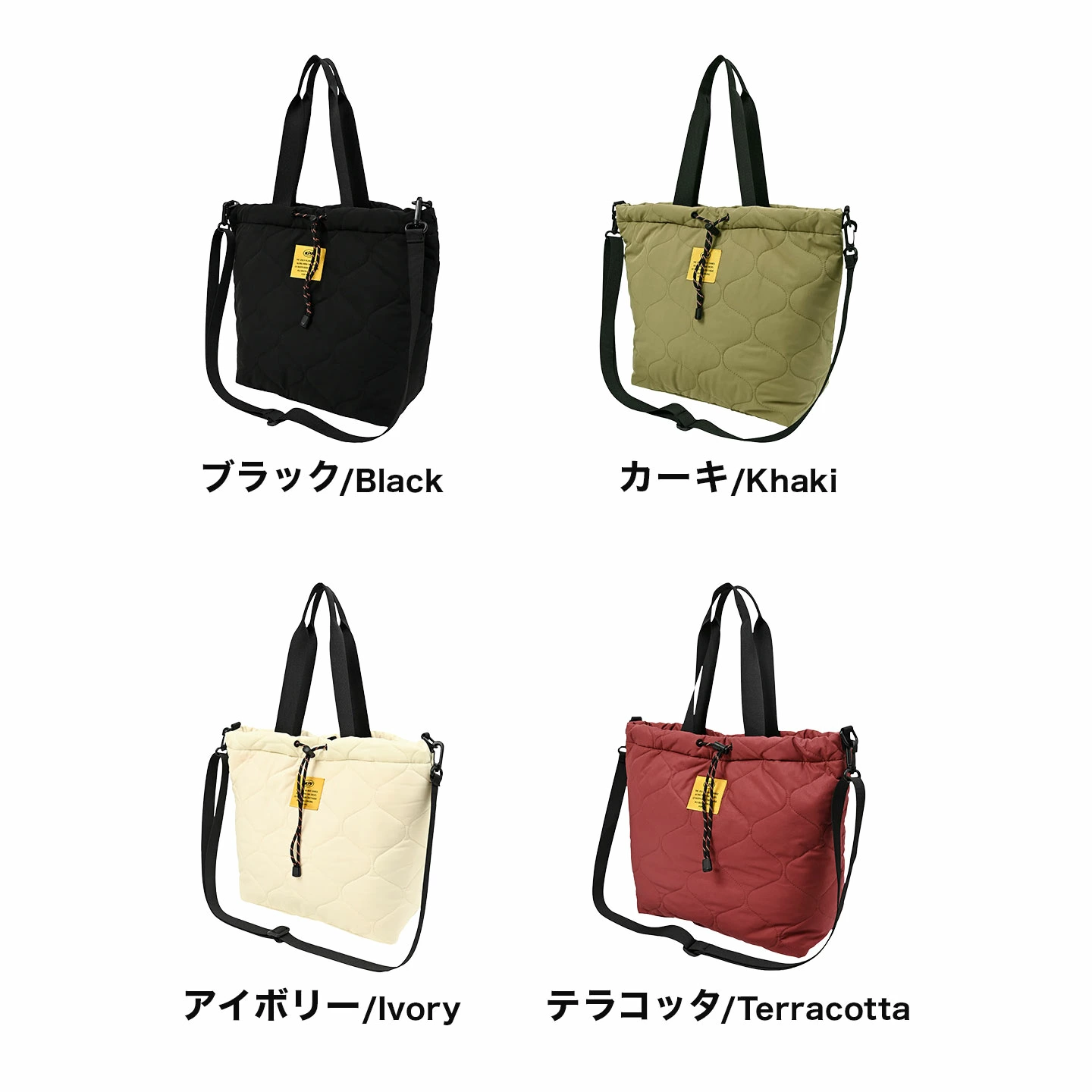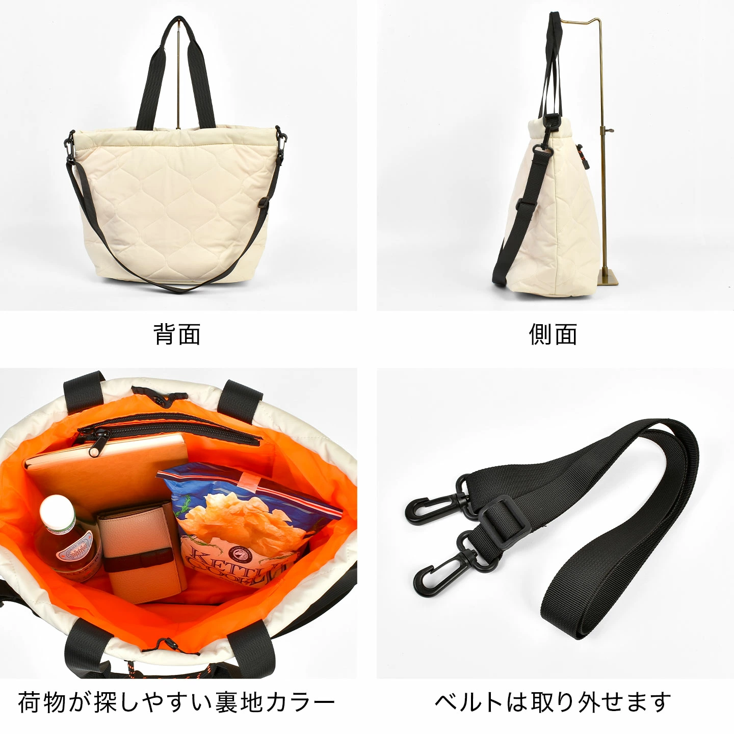 【パデッドドロストトートバッグ】ショルダーにもトートバッグにもできる2WAY仕様で、肩掛けにも対応できる絶妙な長さの持ち手や、2つのファスナー付き内ポケットなど、使いやすさにこだわった設計です。開口部はドローコードで絞れるデザインが施されており、巾着型にフォルムチェンジも可能!気分やスタイルに合わせてアレンジできます◎カラー展開は、落ち着きのあるアースカラーで秋冬コーデにも自然になじみます。また裏地には鮮やかなオレンジ色を採用し、ワークウェアを意識したデザインに。中身が見やすく、荷物が探しやすいという利便性も兼ね備えています。シンプルな中に、さりげないこなれ感を。ニットやコートとの相性も抜群で、季節感をさりげなく演出します。毎日のスタイルに寄り添う、デイリー使いに大活躍間違いなしのアイテムです。