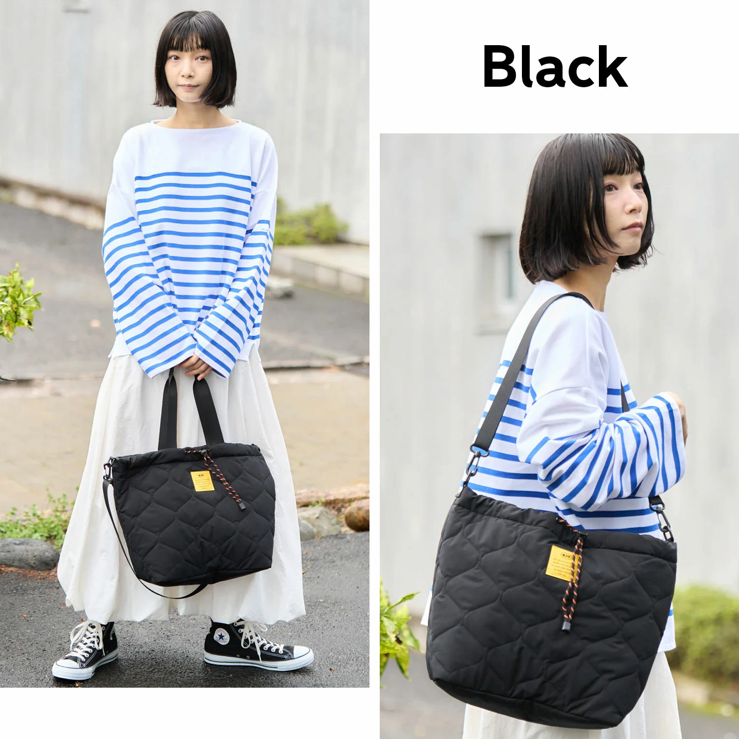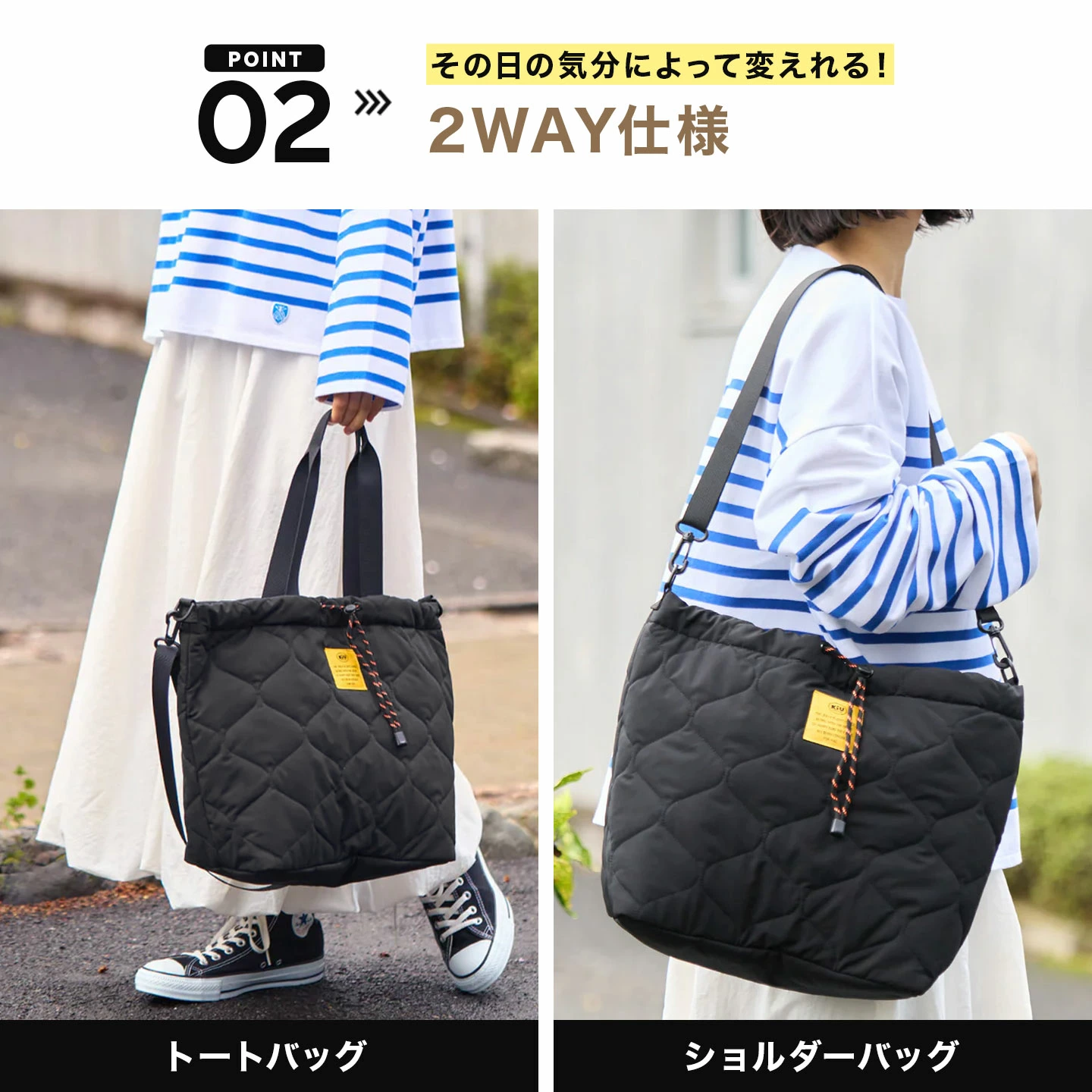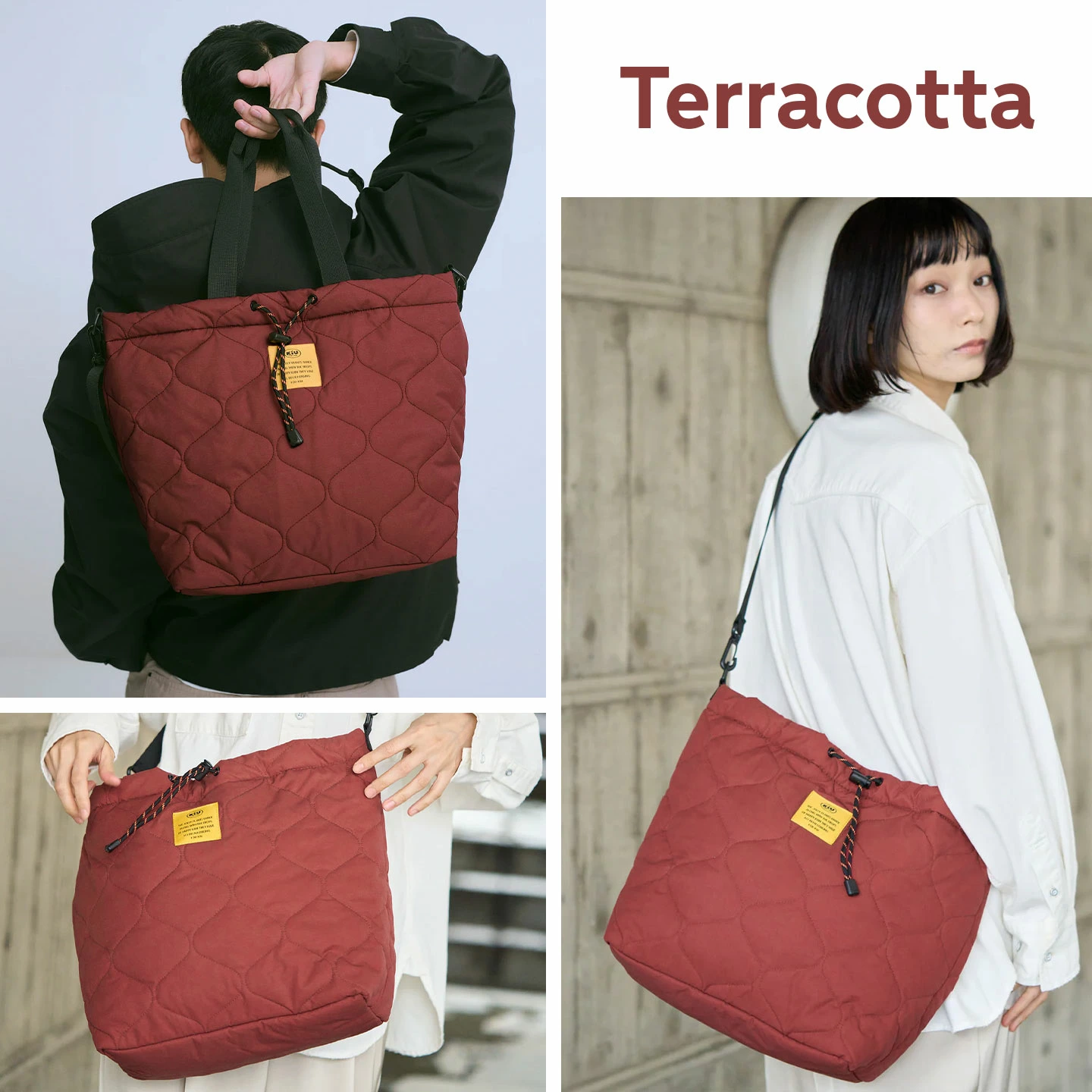 【パデッドドロストトートバッグ】ショルダーにもトートバッグにもできる2WAY仕様で、肩掛けにも対応できる絶妙な長さの持ち手や、2つのファスナー付き内ポケットなど、使いやすさにこだわった設計です。開口部はドローコードで絞れるデザインが施されており、巾着型にフォルムチェンジも可能!気分やスタイルに合わせてアレンジできます◎カラー展開は、落ち着きのあるアースカラーで秋冬コーデにも自然になじみます。また裏地には鮮やかなオレンジ色を採用し、ワークウェアを意識したデザインに。中身が見やすく、荷物が探しやすいという利便性も兼ね備えています。シンプルな中に、さりげないこなれ感を。ニットやコートとの相性も抜群で、季節感をさりげなく演出します。毎日のスタイルに寄り添う、デイリー使いに大活躍間違いなしのアイテムです。