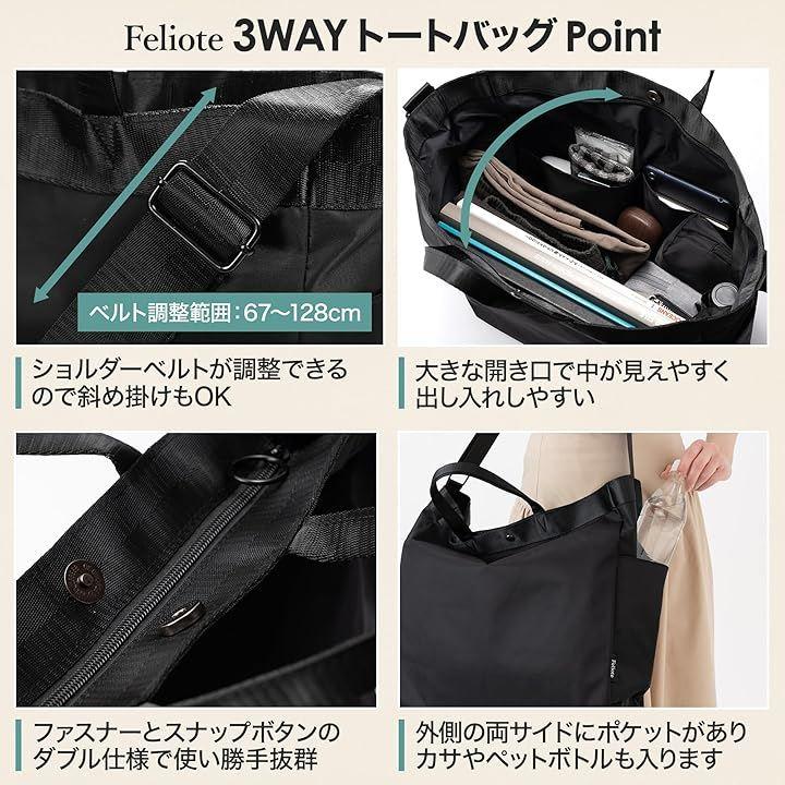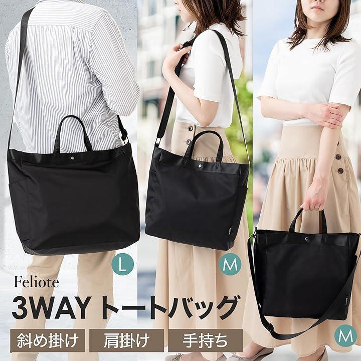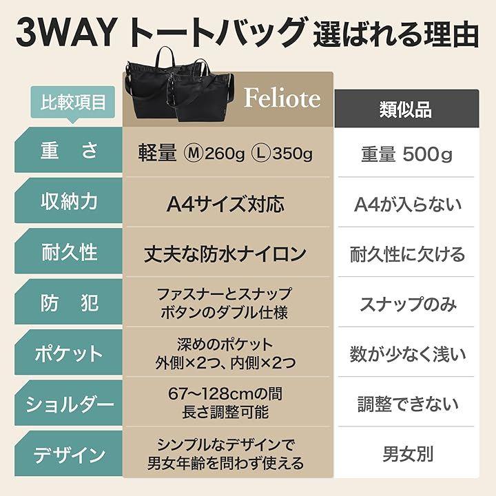 「商品仕様」*Mサイズ寸法:W約29cmxH約30cmxD約11cm 重量約260g *Lサイズ寸法:W約38cmxH約36cmxD約15cm 重量約350g *ショルダーベルトの長さ:67~128cmで調整可能 *カラー:ブラック *素材:表地はコンポジット防水ナイロン、 裏地はナイロン *仕様:ポケット外側2つ 内側2つ、ファスナー付き、スナップボタン付き、折り畳み可 、手洗い可*ブランド:Feliote *ご注意:類似品にご注意ください。