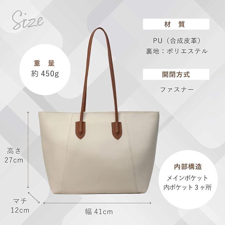 「商品仕様」 ・材質:PUレザー ・裏地:ポリエステル ・重量:約450g ・サイズ:41 x 12 x 27 cm ・形状:スクエア型 ・内部構造:メインポケット+内ポケット3ヶ所 ・開閉方式:ファスナー *モニター環境により色合いが異なる場合があります。