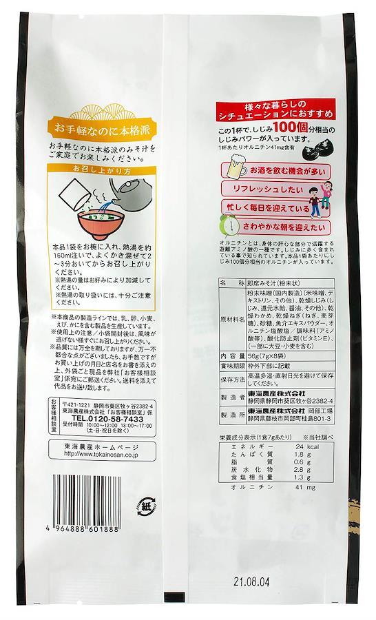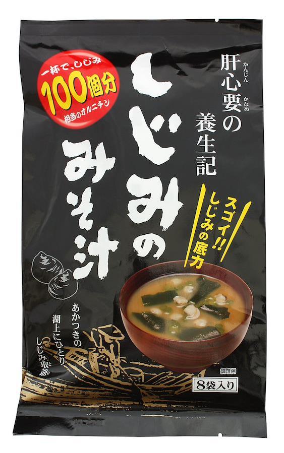 粉末味噌(国内製造)(米味噌、デキストリン、その他)、乾燥しじみ(しじみ、還元水飴、醤油、その他)、乾燥わかめ、乾燥ねぎ(ねぎ、麦芽糖)、砂糖、魚介エキスパウダー、オルニチン塩酸塩/調味料(アミノ酸等)、酸化防止剤(ビタミンE)、(一部に大豆・小麦を含む)