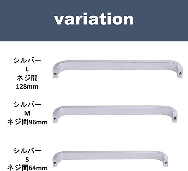 ・「シルバーL」ネジ間128/132mm x 20mm(つまみ厚み10mm)、「シルバーM」ネジ間96/100mm x 20mm(つまみ厚み10mm)、「シルバーS」ネジ間64/68mm x 20mm(つまみ厚み9mm)