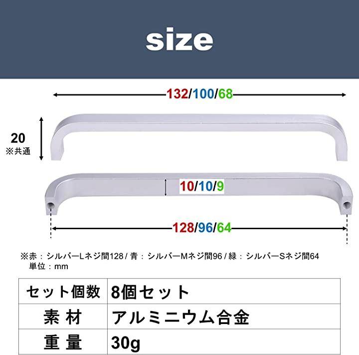「シルバーL」ネジ間128/132mmx20mm(つまみ厚み10mm)「シルバーM」ネジ間96/100mmx20mm(つまみ厚み10mm)「シルバーS」ネジ間64/68mmx20mm(つまみ厚み9mm)セット個数:8個セット,素材:アルミニウム合金重量:30g