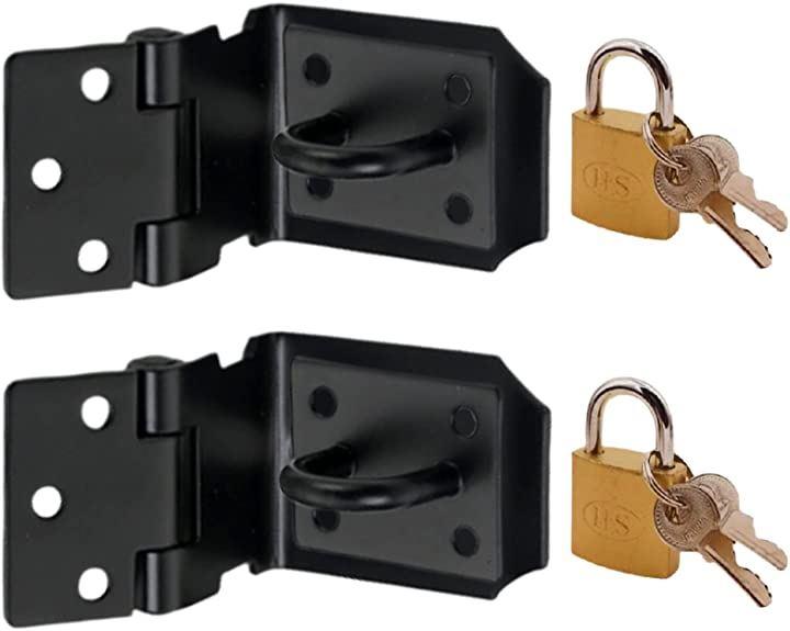 セット内容:直角ラッチ2個(素材:ステンレス カラー:ブラック)、南京錠2個(サイズ:約2.4x2.3x1.1cm 素材:鉄 カラー:ゴールド)