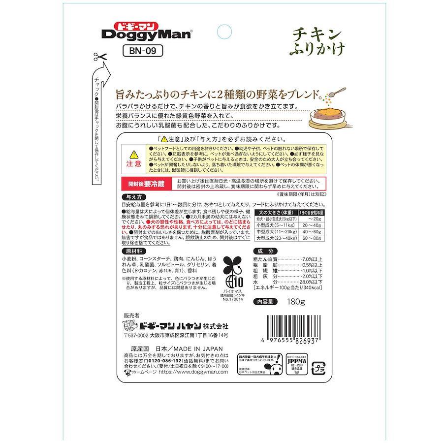 旨みたっぷりのチキンに2種類の野菜をブレンド。パラパラかけるだけでチキンの香りと旨みが食欲をかき立てる。栄養バランスに優れた緑黄色野菜(にんじん・ほうれん草)配合。ジューシーなお肉の香りたっぷり。素材の旨みがよくなじむあらびきサイズ。お腹にうれしい乳酸菌配合。