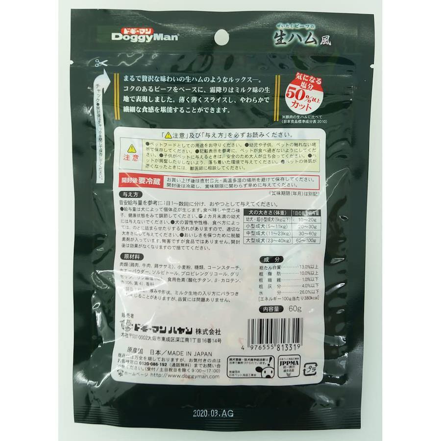 ・ビーフとミルクの風味で愛犬大満足、ルックスも楽しいごほうびスナック。・コクのあるビーフをベースに霜降りに見える部分はミルク味で表現。与えるときも楽しいルックス。・薄く薄くスライスし、やわらかで繊細な食感に愛犬も大満足。・少量でも満足感の得やすいボリューム。
