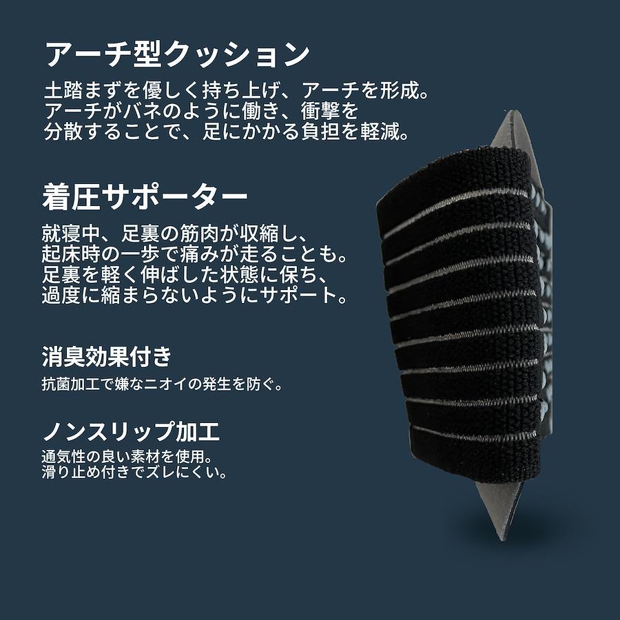 ●足底筋膜炎や偏平足で痛くなりやすい土踏まず、かかとを集中サポート。●フットケア専門ブランドが考えた足底用サポーターです。●足の負担を軽減する独自設計で、足裏を保護して疲れや痛みを和らげます。●通気性・伸縮性に優れた消臭効果付きのベルトを採用。●ずれにくく、ムレにくい。●素足のままでも、靴下の上からでも着用可能です。●睡眠時を含め、あらゆる活動時に着用可能いただけます。●水洗いOKで衛生的。●フリーサイズ。 痛くなりやすい土踏まず、かかとを集中サポート。