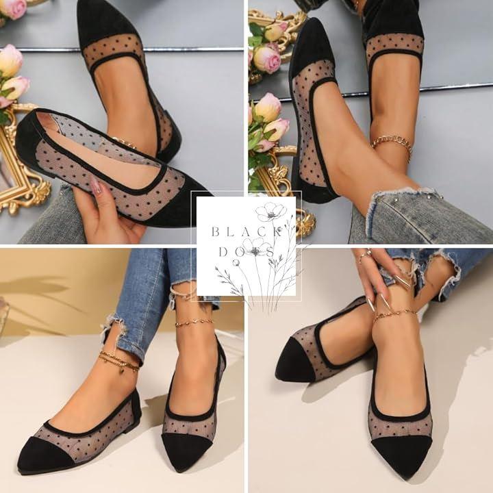 「上品な透け感で足元を華やかに」ドットチュールとスエード調素材を組み合わせた、ポインテッドトゥのフラットパンプス。