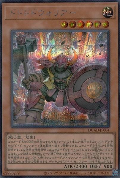 ■搭載パック:[DUAD]DUELISTADVANCE■収録:基本パック■■レアリティ:シークレットレア■種類:効果モンスター■属性:地■種族:戦士族■星(レベル、ランク):6■攻撃力:2300■守備力:900■リンク:‐■リンク方向:‐■ペンデュラムレフト:‐■ペンデュラムライト:‐■■シリーズ:第12期■効果テキスト:このカード名の①②の効果はそれぞれ1ターンに1度しか使用できない。①:デッキから「ドドド」モンスター1体を墓地へ送って発動できる。このカードを手札から特殊召喚する。この効果で特殊召喚したこのカードはレベル4になり、攻撃力は1800になる。この効果の発動後、ターン終了時まで自分はXモンスターしかEXデッキから特殊召喚できない。②:X素材のこのカードがXモンスターの効果を発動するために取り除かれた場合に発動できる。デッキから「ズババ」モンスター1体を手札に加える。■ペンデュラムテキスト:‐