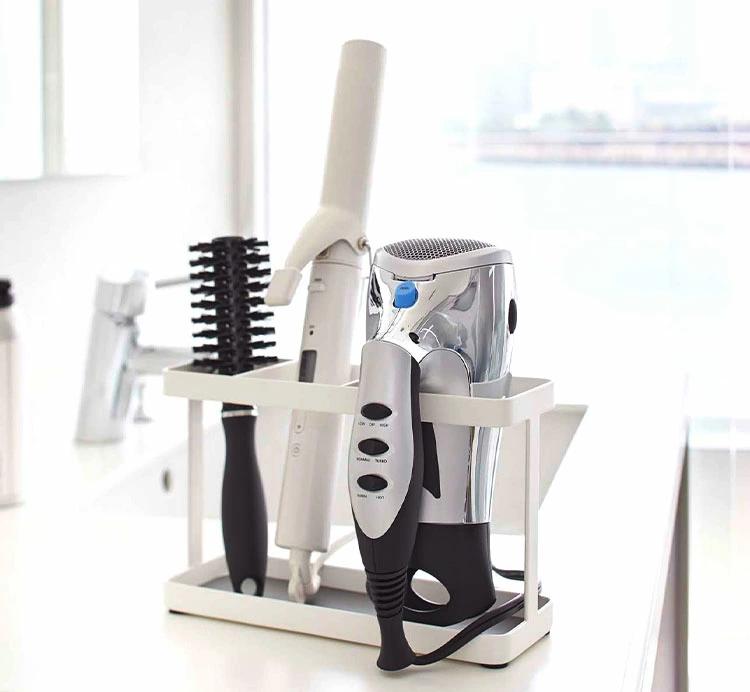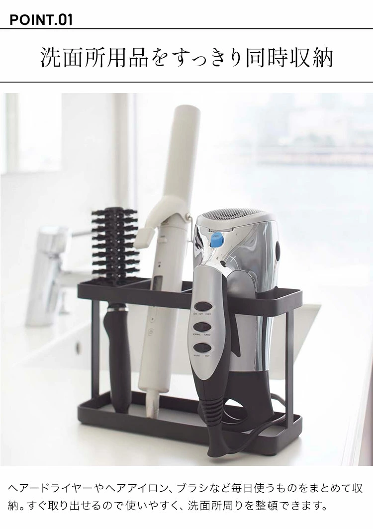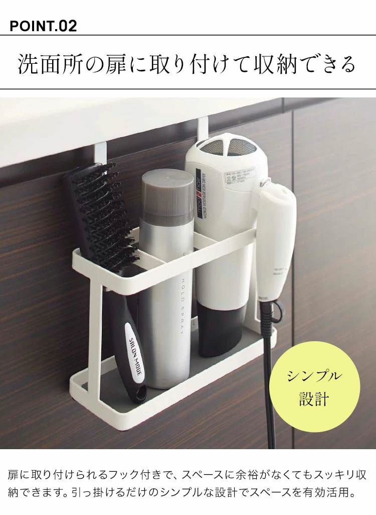ドライヤーやヘアーアイロンをすっきり同時収納!ヘアースプレーやブラシなどのスタイリンング用品も収納できます。すぐ取り出せるので使いやすく、洗面所周りがすっきり片付きます。洗面所の扉にも取り付け可能だから空間を有効活用することも◎コードは付属のフックに巻き付けて収納でき、ブラシ付きドライヤーも収納可能です。