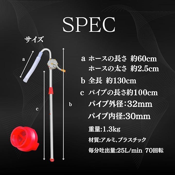 サイズ:全長 約130cm、パイプの長さ 約100cm、ホースの長さ 約60cm、ホースの太さ 約2.5cm、70回転で約26L